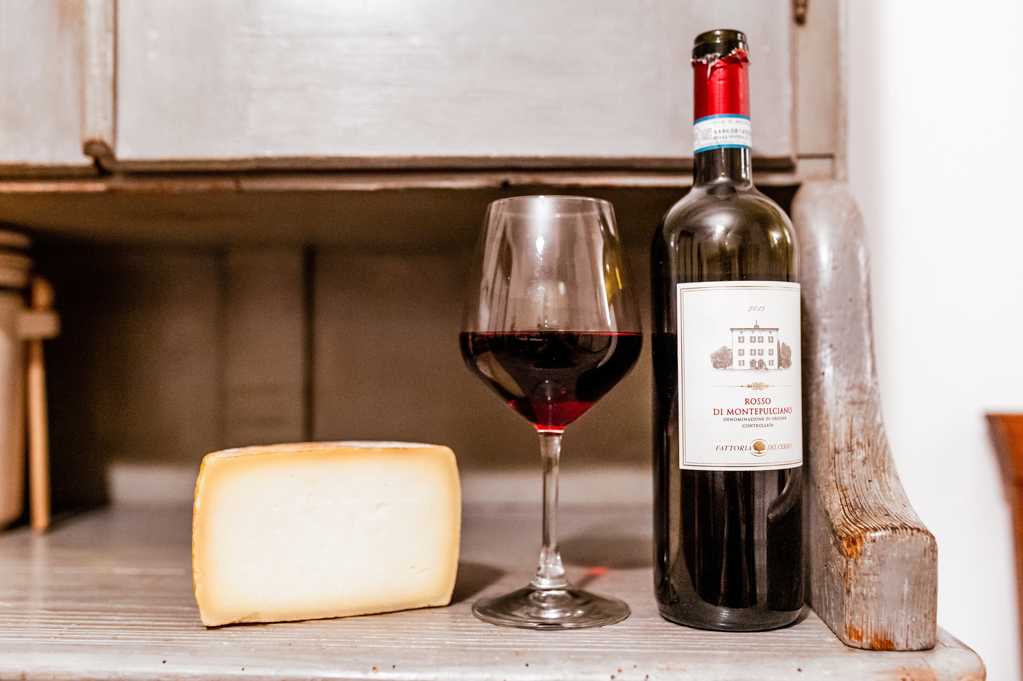 El Rosso di Montepulciano es un vino más joven y cotidiano, de gran equilibrio y elegancia, con evidentes notas de fruta roja y violeta, y muy versátil para acompañar las comidas. Es el hermano menor del Vino Nobile, que envejece 18 meses entre barricas y roble de Eslavonia.