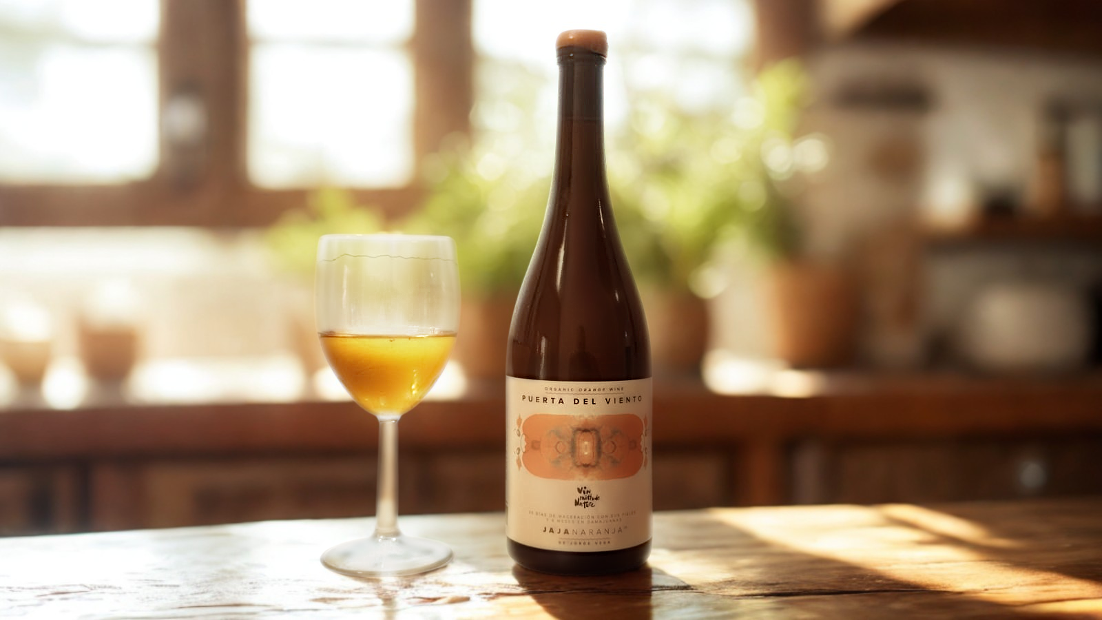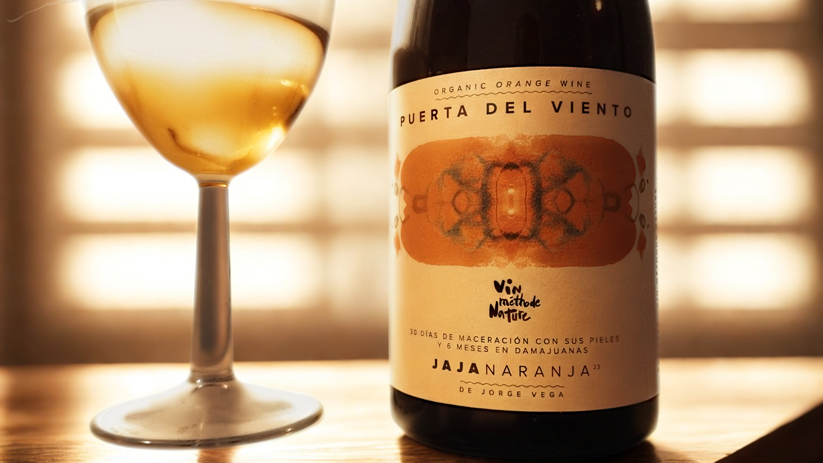JAJA Orange Wine Puerta del Viento 2023 es un vino natural que elabora la bodega Puerta del Viento Wines en El Bierzo. Un espectacular «orange wine» que tiene 30 días de maceración con sus pieles y seie meses de crianza posterior en damajuanas (ánforas de barro), lo que le da persnaliza sin restarle ni un ápice de frescura y presencia de fruta. Un vino con una producción de tan solo 477 botellas.