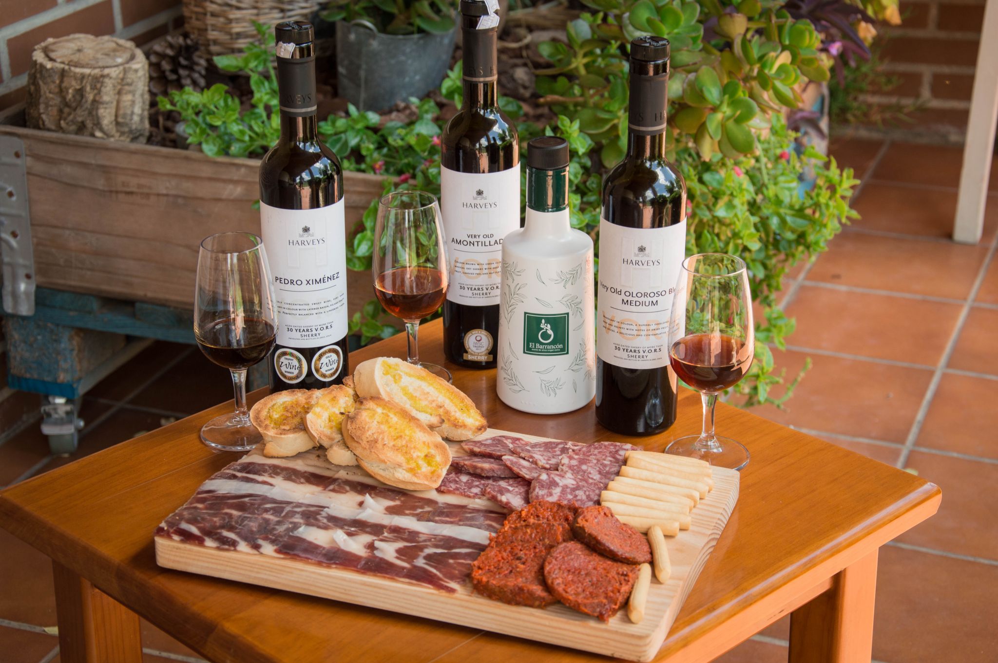 Para la presentación se ha optado por una clásica tabla de madera, donde se han acompañado los ibéricos con unas tostadas de pan con aceite y unos tradicionales colines. Los vinos Harveys V.O.R.S. se han servido en copas de Jerez, conocidas también como “catavinos”. En este caso, por comodidad, se ha prescindido de los estuches a la hora de servir.
