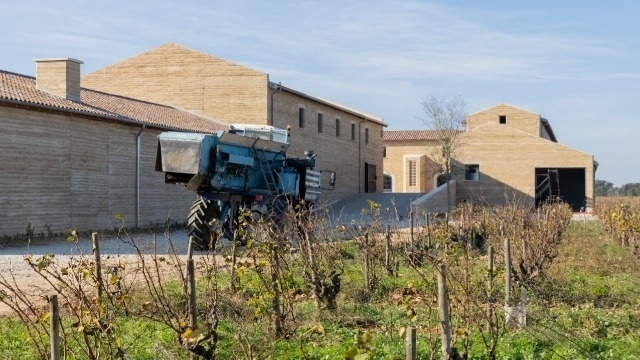 Al definir su arquitectura como «una gestación natural del paisaje», Bijoy Jain concibió un proyecto profundamente arraigado en la tierra: 6000 metros cuadrados de edificios preservados, 4000 metros cuadrados de bodegas recién excavadas y materiales reutilizados del propio terreno: suelos silíceos, guijarros, arcillas rojas, arena y grava. El sistema energético se basa en recursos naturales: agua de lluvia, aire, sol y tierra. En el corazón del diseño, a nueve metros bajo tierra, una balsa de 2000 metros cúbicos recoge el agua de lluvia filtrada, mientras que el aire, impulsado por el viento Mistral, circula a través de torres de viento (puits provençaux), enfriando de forma natural antes de ventilar las zonas subterráneas de vinificación y almacenamiento. En funcionamiento en 2025, la nueva bodega es autosuficiente en casi un 80 % en agua, electricidad, calefacción y refrigeración.