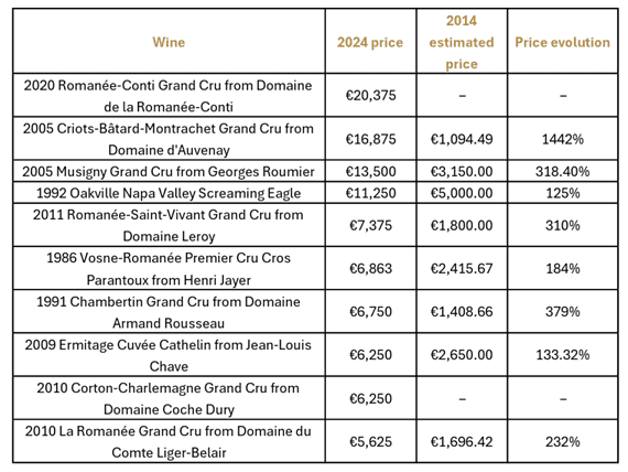 Para celebrar el increíble año 2024 de iDealwine, la compañía ha analizado los 10 vinos más caros de ese año y ha calculado su evolución en los últimos 10 años, considerando un vino por productor. El vino en primer lugar no presenta una evolución de precio de 10 años, ya que se elaboró hace solo 5 años, y el de Coche Dury tampoco cuenta con esta estadística, ya que su lanzamiento era inminente en 2014.