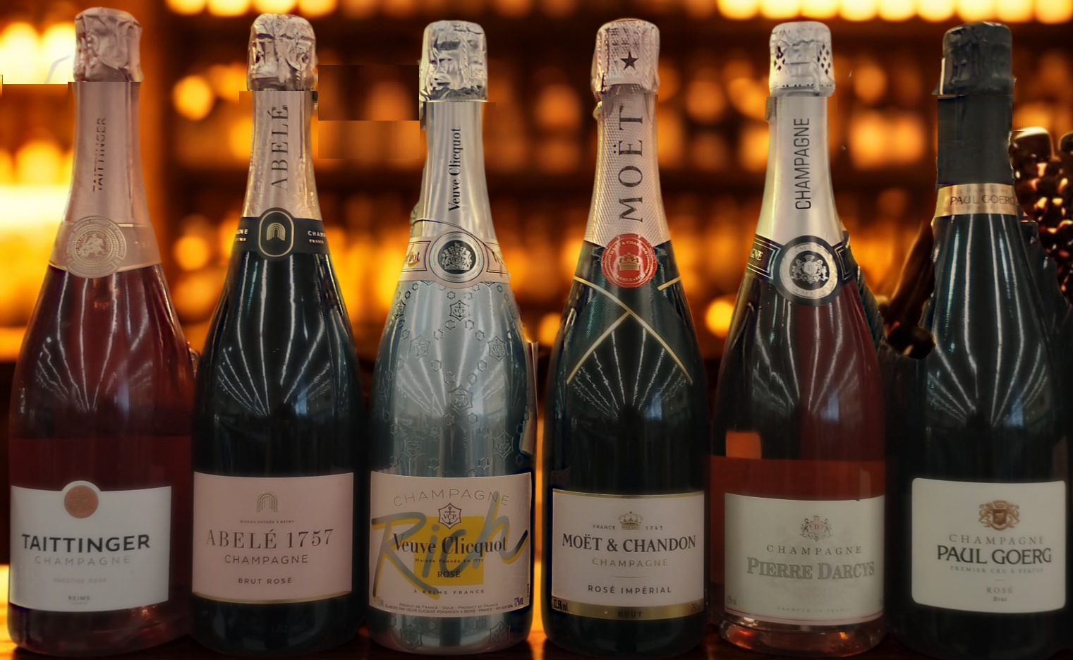 Os acercamos los champgnes Taittinger Champagne Rosé, Abelé 1757 Brut Rosé, Veuve Clicquot Rosé Rich, Moët & Chandon Imperial Rosé, Pierre Darcys Rosé y Paul Goerg Rose.