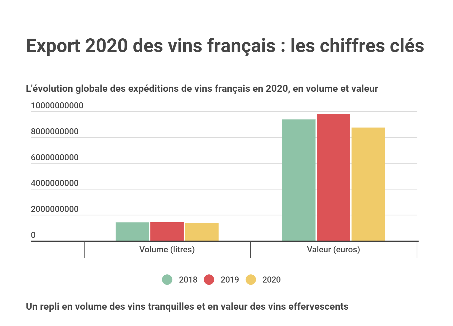 Las cifras de cierre de las exportaciones de vino francés se situaron en 13,6 millones de hectolitros con un valor de 8,7 mil millones de euros en valor. Estas cifras suponen una caída con respecto al año anterior de 4,9% y 10,8% respectivamente.
