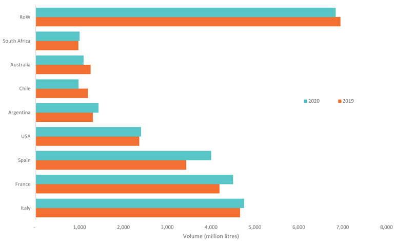 Según datos facilitados por la OIV, la producción de estimada en millones de litros de vino a nivel mundial para este presente año 2020 será la siguiente:
