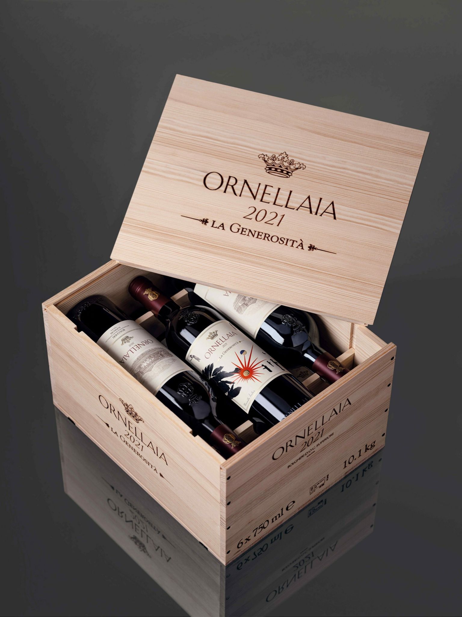 Ornellaia 2021 debuta en el mercado el 1 de abril , con cada caja de seis botellas de la añada (botellas de 750 ml) realzadas por una etiqueta artística.